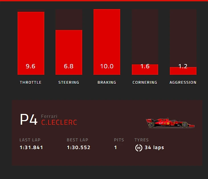 Третье место занял Шарль Леклер из «Феррари». Его оценка в 5,8 сложилась из 9,6 за работу с педалью газа, 6,8 за работу рулем, 10 за работу на торможениях, 1,6 за прохождение поворотов и 1,2 за «агрессивность». Монегаск стартовал восьмым и приехал четвертым.