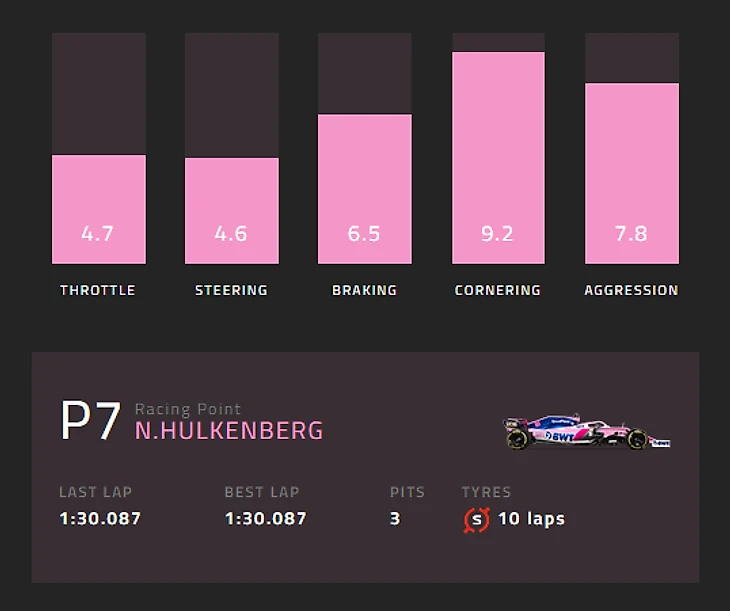 Второе место досталось Нико Хюлькенбергу из «Рейсинг Пойнт». Его оценка в 6,6 сложилась из 4,7 за работу с педалью газа, 4,6 за работу рулем, 6,5 за работу на торможениях, 9,2 за прохождение поворотов и 7,8 за «агрессивность». №27 стартовал 3-м и финишировал седьмым.