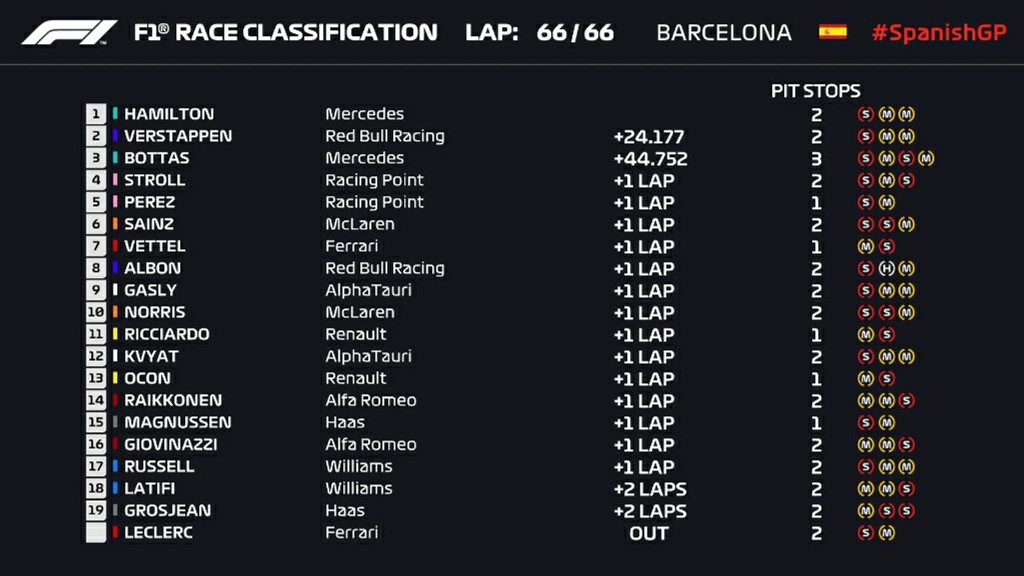 Боттас проиграл Хэмилтону в квалификации меньше одной десятой, но на старте провалился аж на четвёртое место: Макс стал вторым, Лэнс - третьим. Что было дальше? Да по сути ничего. Льюис спокойно уехал от Ферстаппена, Боттас же ограничился лишь обгоном Стролла. Розовые болиды финишировали на четвёртом и пятом местах, хорошая гонка удалась Карлосу и Себу, вновь далеко позади партнера по команде Албон, вновь в очки приехал Гасли. Единственным сошедшим стал Леклер.