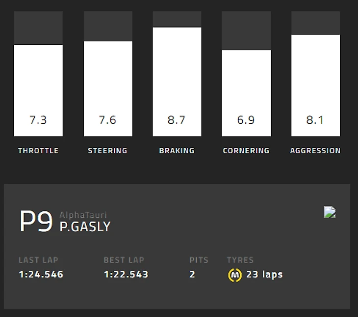 В соответствии с рейтингом лучше всех пилотировал Пьер Гасли из «Альфа Таури» – его оценка в 7,7 сложилась из 7,3 за работу с педалью газа, 7,6 за работу рулем и 8,7 за работу на торможениях, 6,9 за прохождение поворотов и 8,1 за «агрессивность». Француз стартовал 10-м и финишировал 9-м.