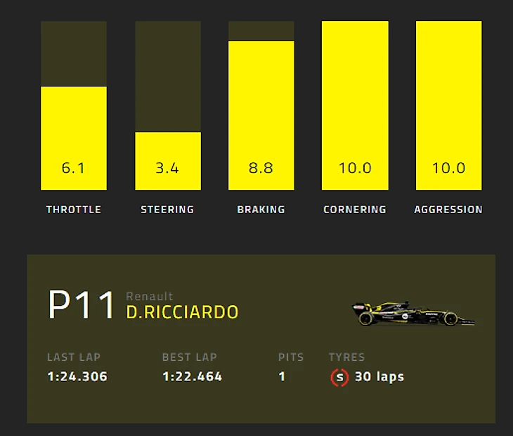 Второе место занял Даниэль Риккардо из «Рено» – с той же оценкой в 7,7 (попал в топ-3 вторую гонку подряд). Она сложилась из 6,1 за работу с педалью газа, 3,4 за работу рулем, 8,8 за работу на торможениях, 10 за прохождение поворотов и 10 за «агрессивность». Дэн стартовал 13-м и финишировал 11-м.