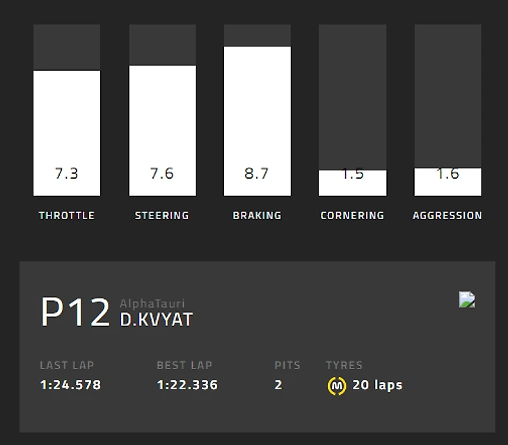 Даниил Квят получил оценку в 5,4 балла и оказался на седьмом месте в рейтинге. Она сложилась из 7,3 за работу с педалью газа, 7,6 за работу рулем, 8,7 за работу на торможениях, 1,5 за прохождение поворотов и 1,6 за «агрессивность». Россиянин стартовал и финишировал 12-м.