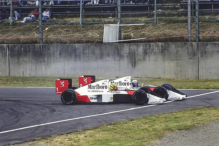 Когда Сенна попытается обогнать Проста за шесть кругов, оставшихся на Гран-при Японии 1989 года в Сузуке, и одержит победу, которая позволит ему приехать в Аделаиду лидером чемпионата, Прост повернет в его сторону.