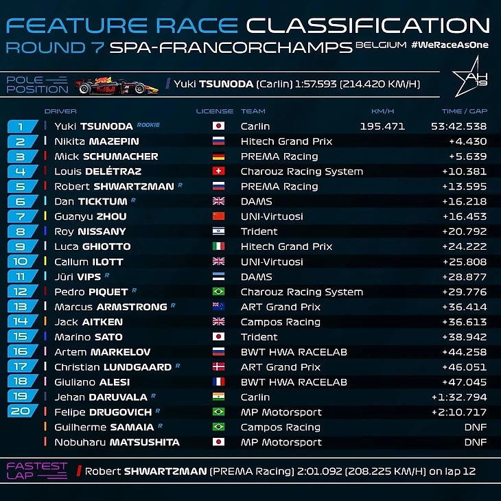 В итоге победителем гонки стал Юки Цунода. Японец ко вчерашним четырём очкам сегодня добавил ещё 25 и теперь отстаёт от лидера общего зачёта лишь на 11 очков. Гонка для Юки чем-то напоминала заезд в Штирии: тогда Цунода тоже взял поул, уверенно лидировал, но совершил неудачный визит в боксы и уступил на финише россиянину.