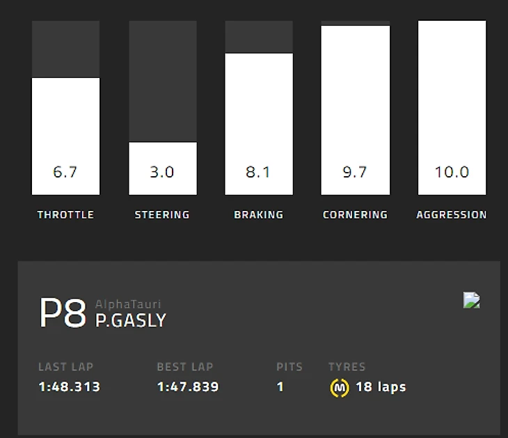 В соответствии с рейтингом лучше всех пилотировал Пьер Гасли из «Альфа Таури» – его оценка в 7,5 сложилась из 6,7 за работу с педалью газа, 3,0 за работу рулем и 8,1 за работу на торможениях, 9,7 за прохождение поворотов и 10 за «агрессивность». Француз стартовал 12-м и финишировал 8-м.