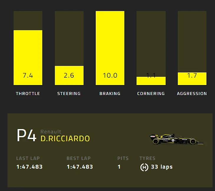 Третье место занял Даниэль Риккардо из «Рено». Его оценка в 4,6 сложилась из 7,4 за работу с педалью газа, 2,6 за работу рулем, 10 за работу на торможениях, 1,1 за прохождение поворотов и 1,7 за «агрессивность». Австралиец приехал четвертым и не достал до подиума всего 3 секунды.