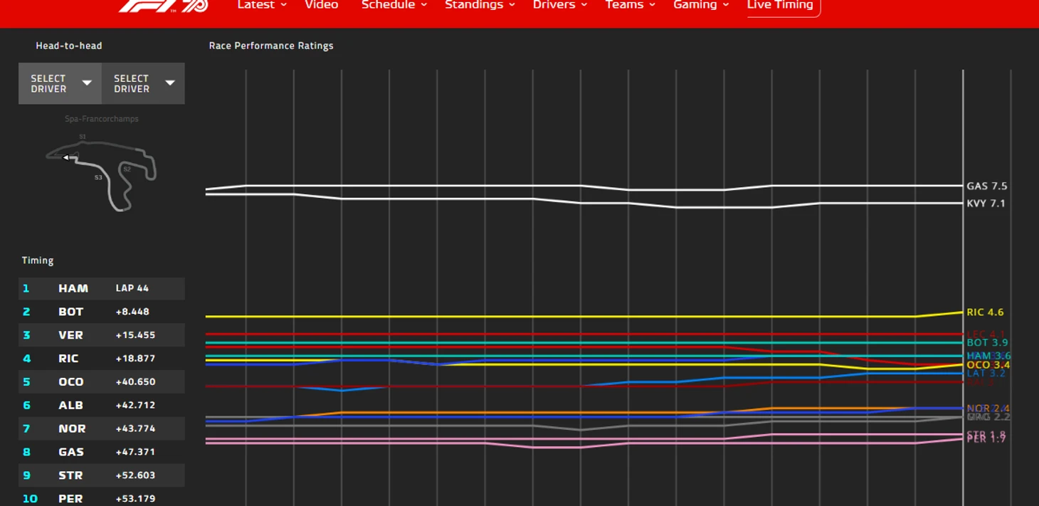 После каждой гонки на официальном сайте «Формулы-1» в разделе лайвтайминга на странице «выступлений» публикуются оценки пилотам за Гран-при по данным телеметрии. Вот – рейтинг после заезда в Бельгии.