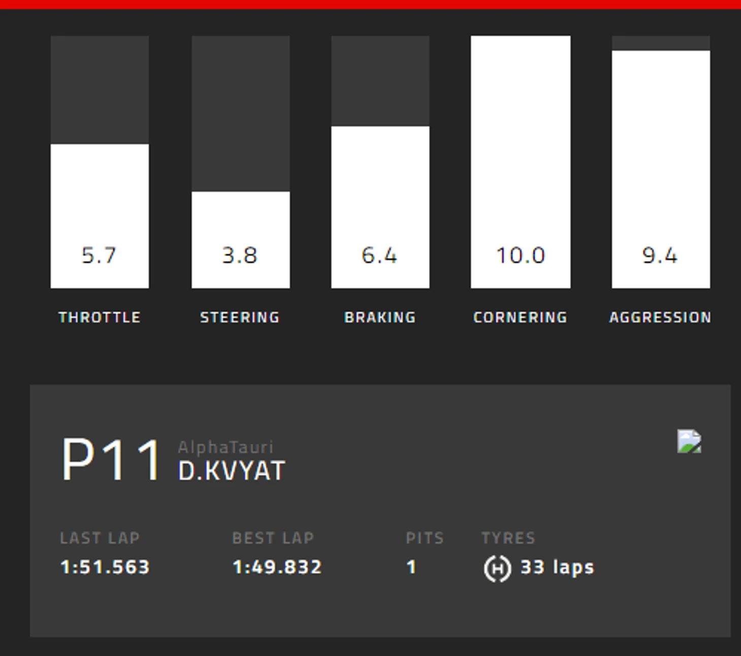 Второе место досталось Даниилу Квяту. Его оценка в 7,1 сложилась из 5,7 за работу с педалью газа, 3,8 за работу рулем, 6,4 за работу на торможениях, 10 за прохождение поворотов и 19,4 за «агрессивность». Россиянин стартовал и финишировал 11-м.