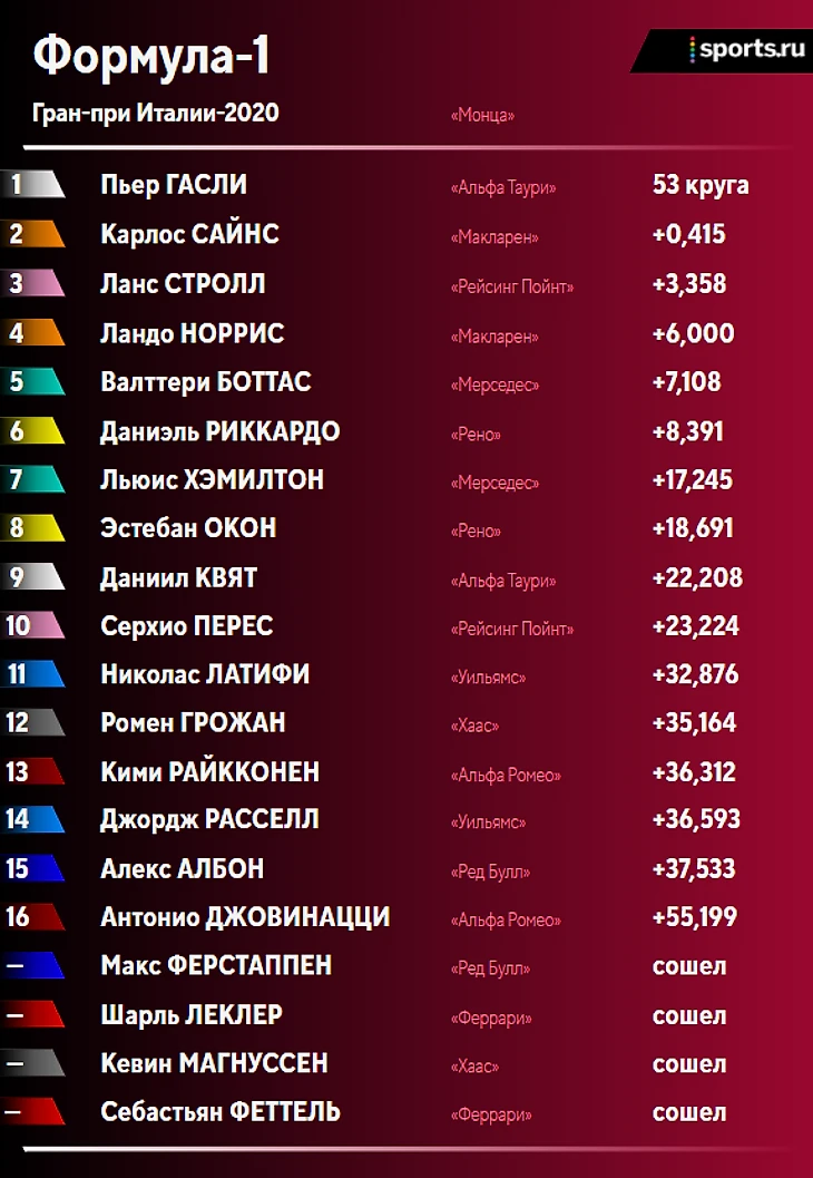 Пьер Гасли (1-й): «За последние 18 месяцев я прошел через многое, и теперь в Монце я выиграл свою первую гонку в «Ф-1». Команда сделала для меня многое, дала шанс и возможность – мой первый подиум и первую победу».