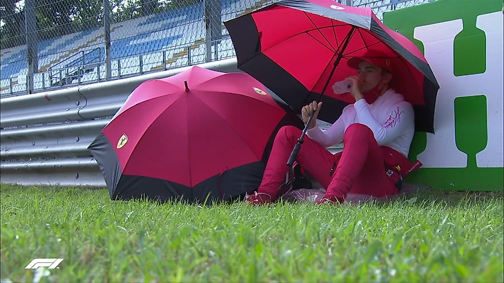 15:48 Шарль Леклер спрятался под зонтиком и пьет водичку.