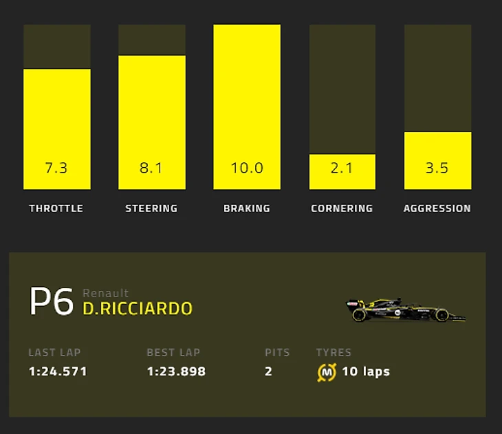 Второе место занял Даниэль Риккардо из «Рено» – оценкой в 6,2. Она сложилась из 7,3 за работу с педалью газа, 8,1 за работу рулем, 10 за работу на торможениях, 2,1 за прохождение поворотов и 3,5 за «агрессивность». Дэн финишировал шестым.