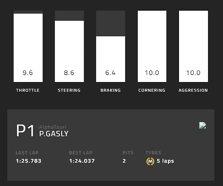 Сейчас же оценка Пьера аж в 8,9 сложилась из 9,6 за работу с педалью газа, 8,6 за работу рулем и 6,4 за работу на торможениях, 10 за прохождение поворотов и 10 за «агрессивность». Француз стартовал 10-м и финишировал первым – привезя всем конкурентам более трех баллов по данным «Формулы-1»! Просто невероятно: пилотировал как минимум на 50 процентов лучше любого соперника.