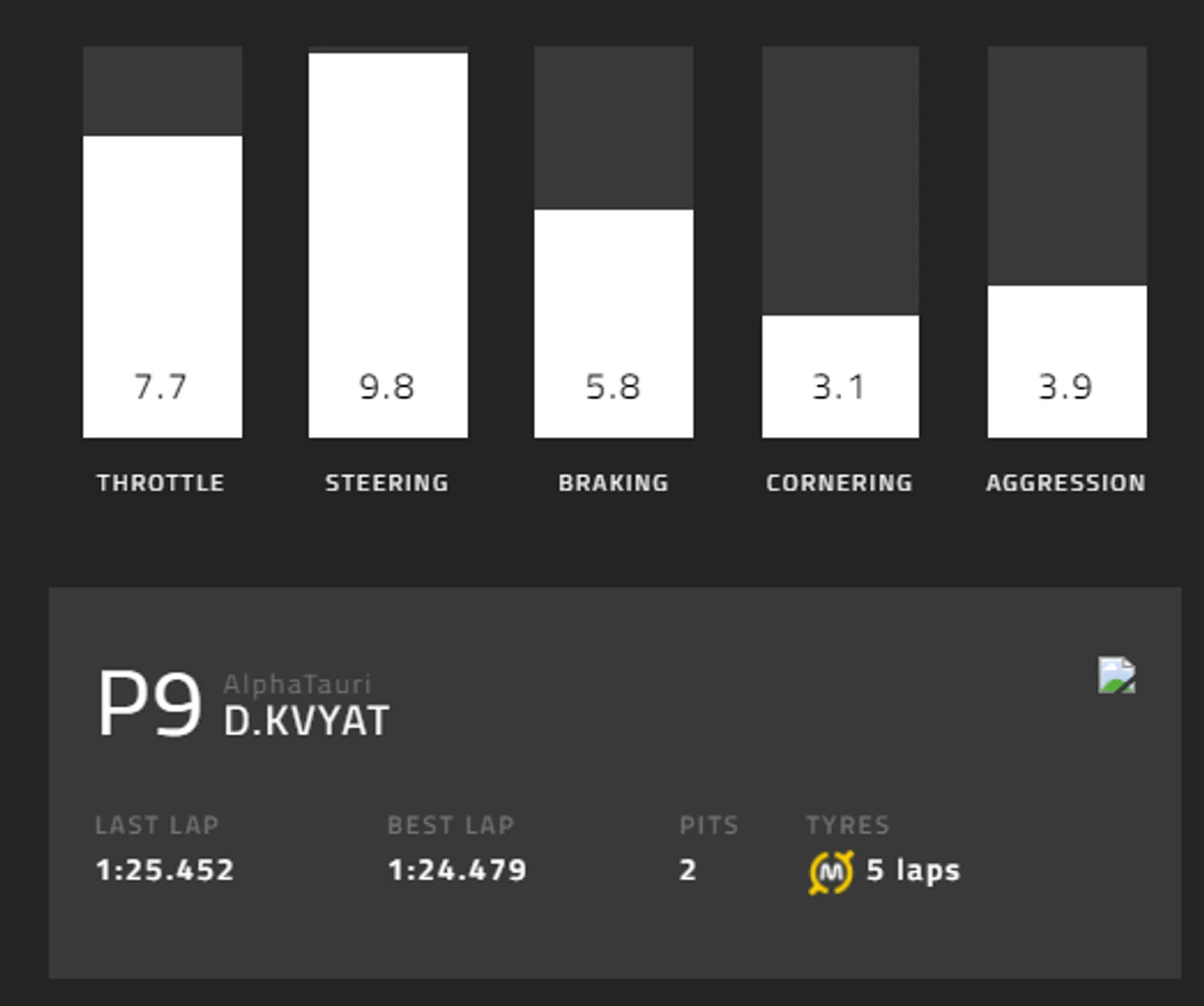 Третье место занял Даниил Квят из «Альфа Таури». Его оценка в 6,1 сложилась из 7,7 за работу с педалью газа, 9,8 за работу рулем, 5,8 за работу на торможениях, 3,1 за прохождение поворотов и 3,9 за «агрессивность». Россиянин стартовал 11-м и приехал на финиш 9-м.