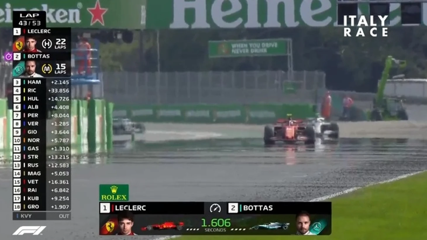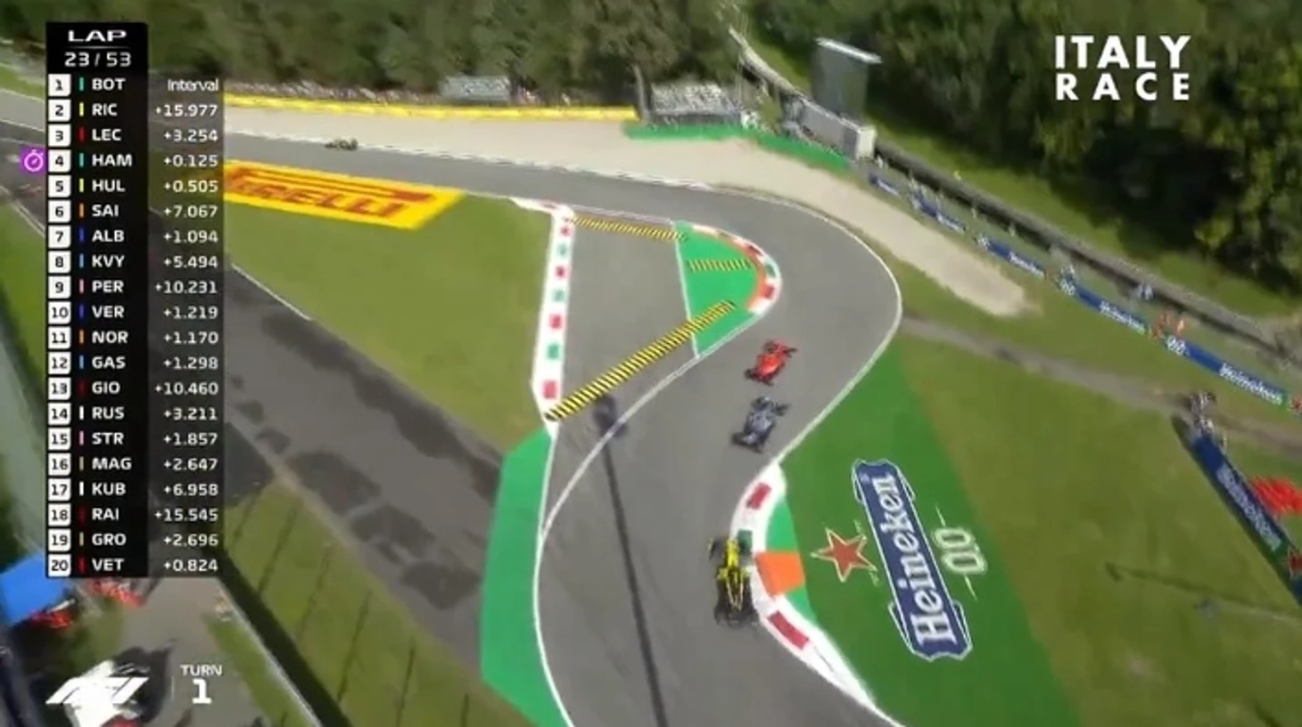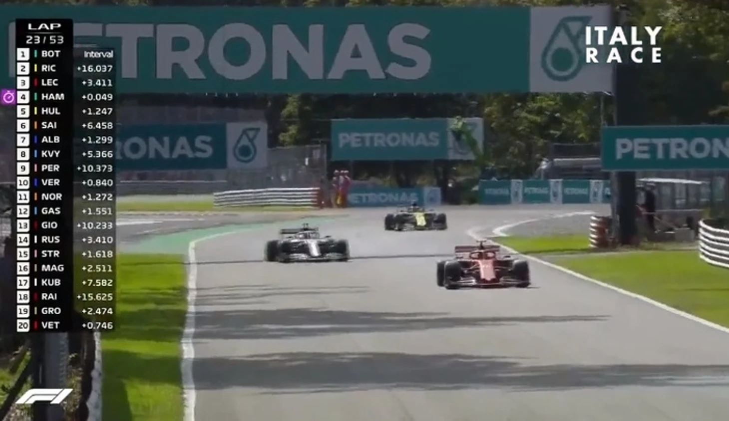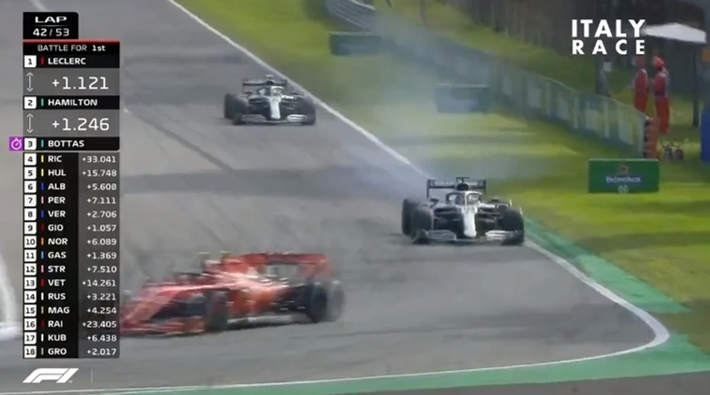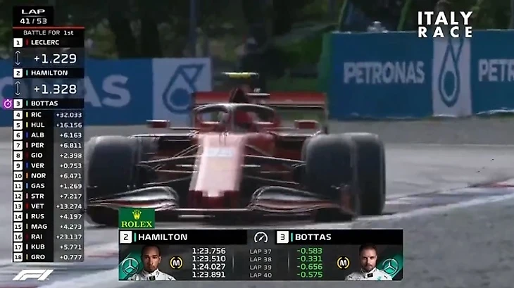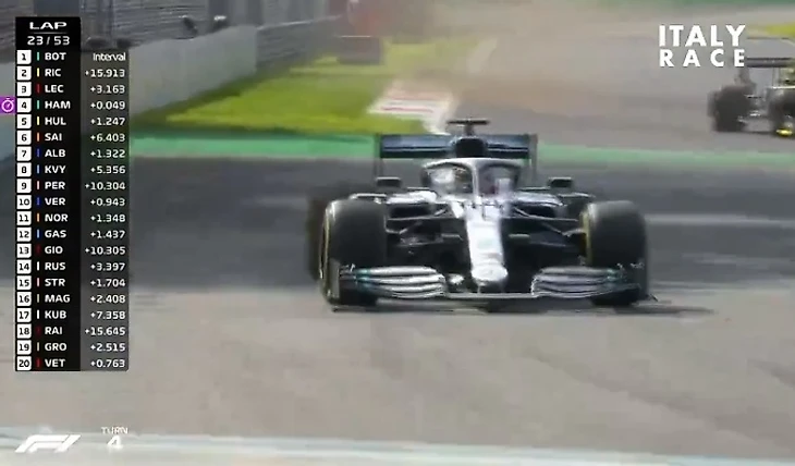 Происходит контакт, Леклер отбивает атаку Хэмильтона, а британцу приходится объезжать поворот и возвращаться на трассу слегка позади монегаска. У Шарля появляется небольшая передышка, но дальше Льюис все также держится в секунде от болида Ferrari.