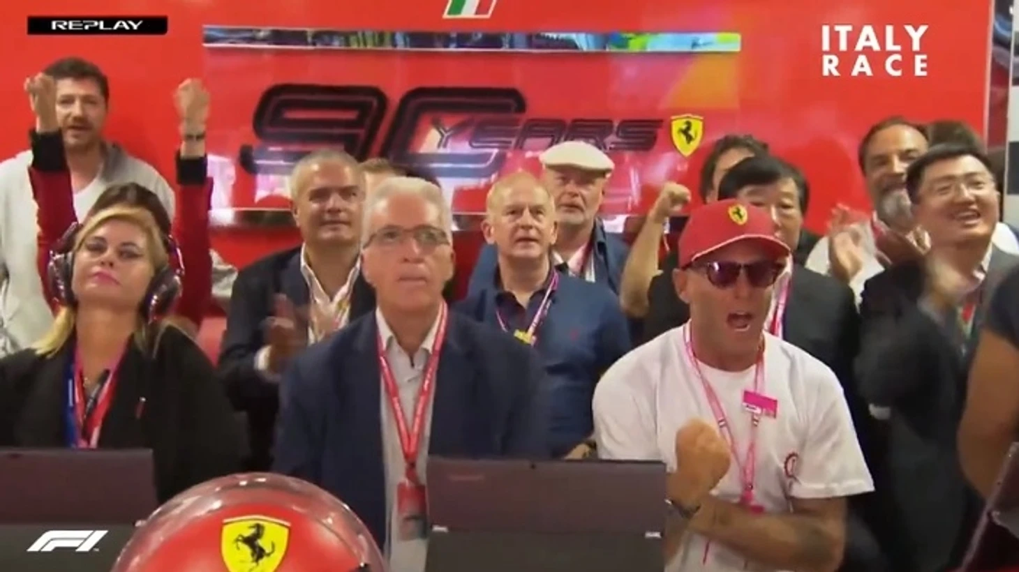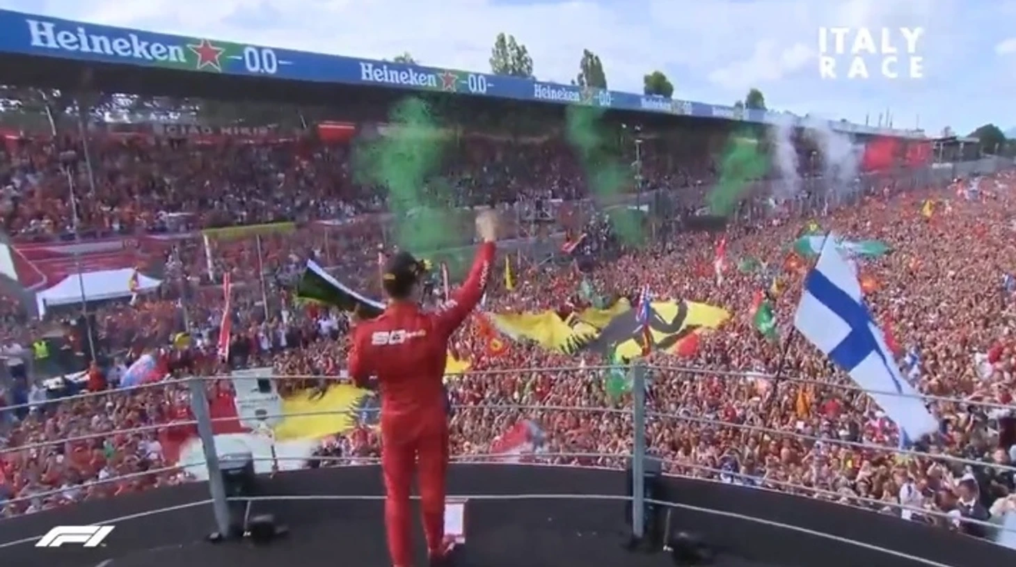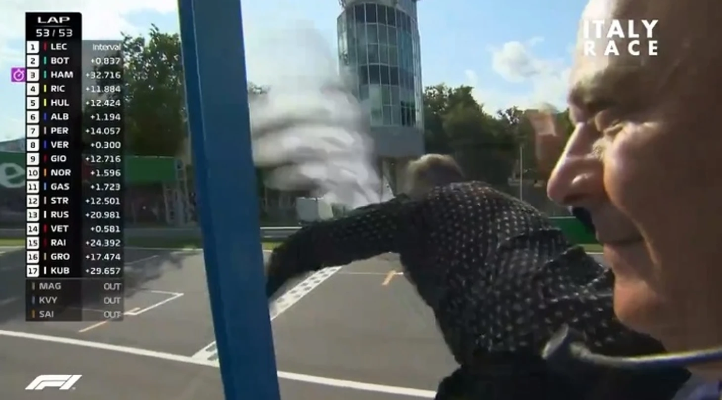 Льюис за несколько кругов до конца заехал в боксы за Soft, чтобы поставить лучшее время круга и заработать дополнительное очко, но все это уже было не важно. Ведь Жан Алези поднимается, чтобы взмахнуть клетчатым флагом! И для кого? Для Шарля Леклера, пилота Ferrari, в Монце, итальянской трассе. Потрясающе!