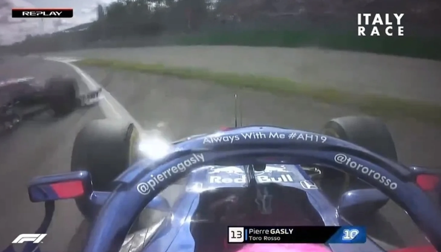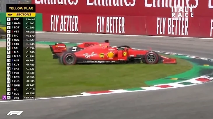 При развороте вынесло слегка с трассы. Но страшное не этом не закончилось. Феттель старается вернуться на трассу, но делается это крайне опасно. При выезде с травы задевает проезжающего мимо него Стролла, которого тоже разворачивает из-за этого эпизода. Стролл же, в свою очередь, тоже при возвращении на трассу совершает возвращение в манере, подобной четырехкратному чемпиону - разворачивая другого. В этот раз не повезло Пьеру Гасли.