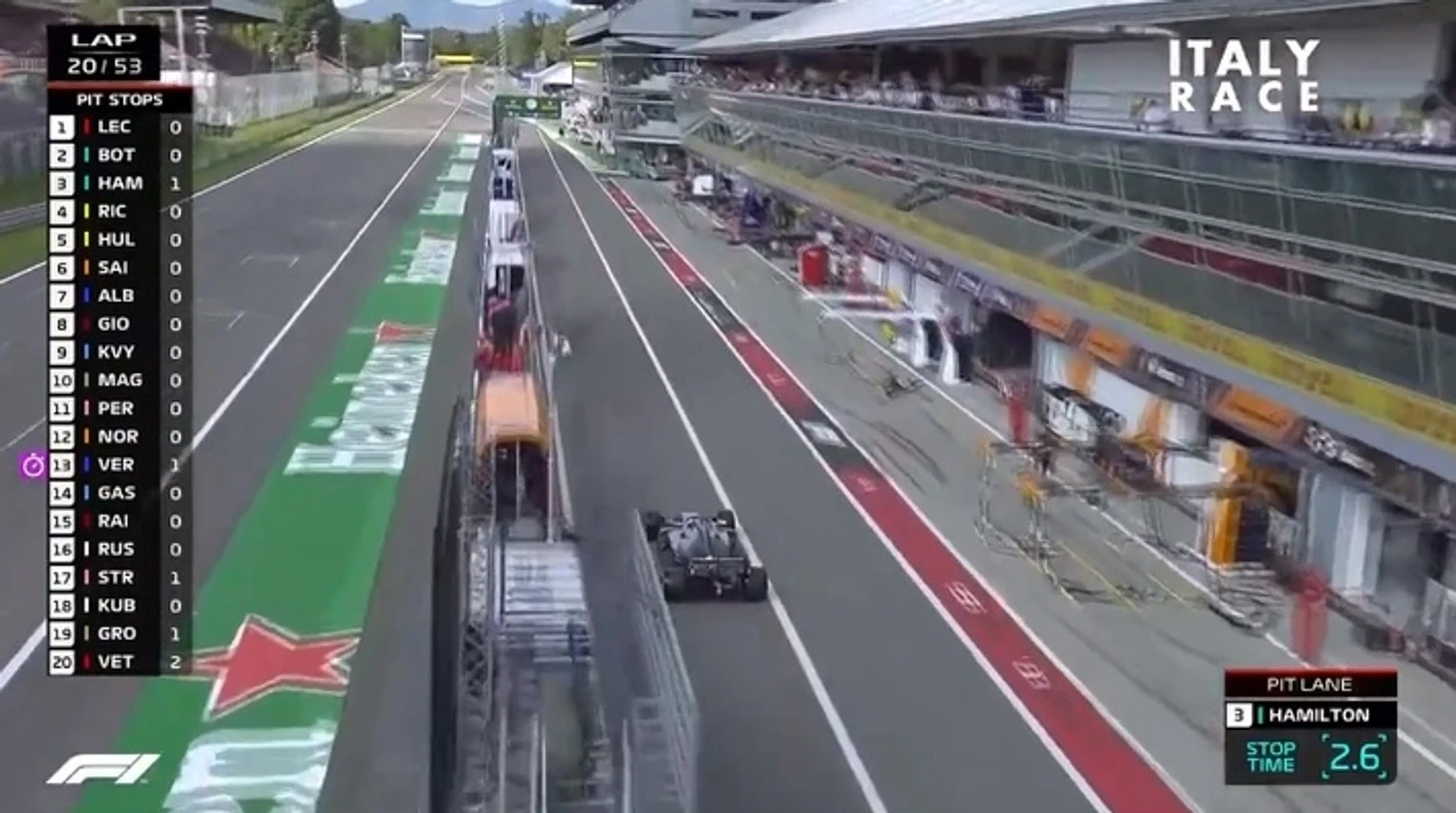 На 20 круге гонка приобретает новый виток интереса. Один из гонщиков лидирующей группы сворачивает на пит-лейн и это Льюис Хэмильтон.