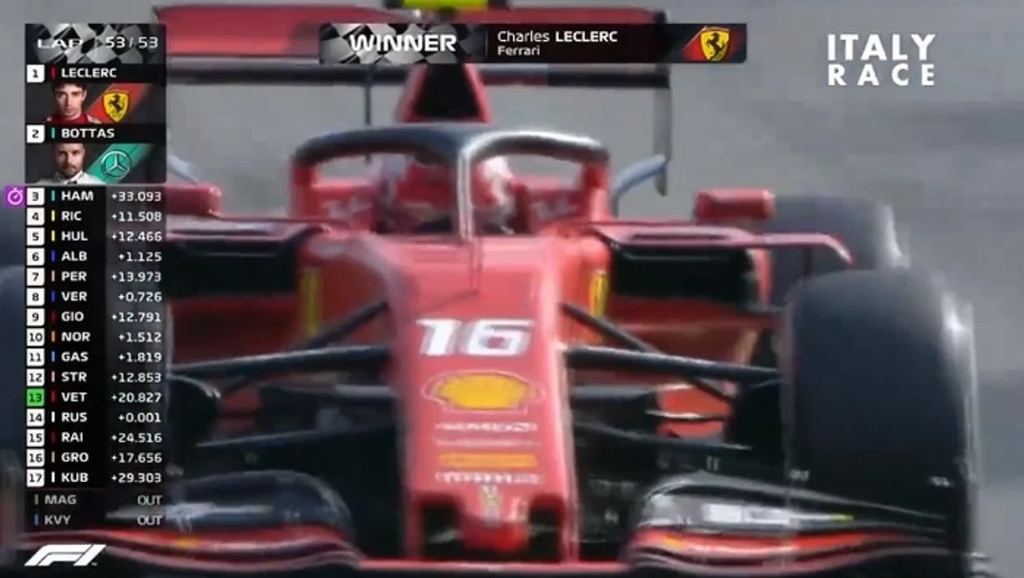 Самое тяжелое - позади. Впереди только приятное - интервью в качестве победителя, выход на подиум и подъем на высшую ступень пьедестала на глазах у итальянских болельщиков будучи пилотом Ferrari. Наверняка это непередаваемые эмоции, хотя... Откуда мне знать?Конечно, глобально на борьбу в чемпионате это никак не сказалось. Вальттери отыграл у Льюиса лишь пару очков, тем самым отрыв уменьшился очень незначительно. Льюис остался впереди с огромным преимуществом. Разве что Шарль опередил в личном зачем Себастьяна Феттеля. Да, Ferrari были далеки от победы в том чемпионате, но победа в Монце, на итальянской земле, подарили всем тиффози приятные воспоминания и надежду, в что в скором времени победы буду отмечаться не только в Италии.