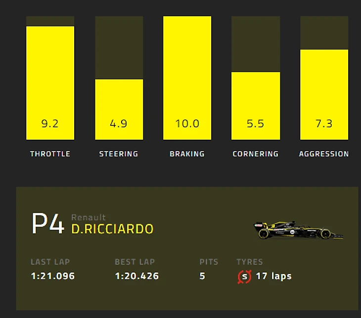 В соответствии с рейтингом лучше всех пилотировал Даниэль Риккардо из «Рено». Оценка №3 в 7,4 сложилась из 9,2 за работу с педалью газа, 4,9 за работу рулем и 10 за работу на торможениях, 5,5 за прохождение поворотов и 7,3 за «агрессивность». Дэн стартовал восьмым и финишировал четвертым.