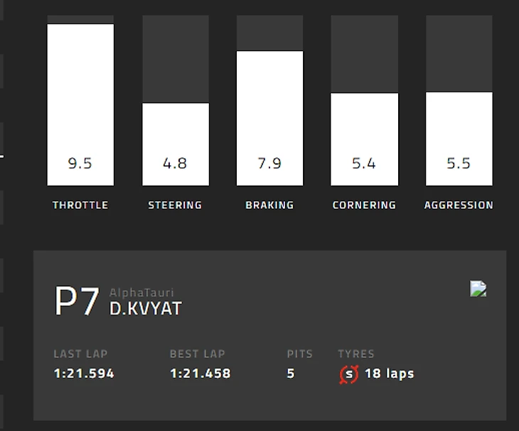 Третье место занял Даниил Квят из «Альфа Таури». Его оценка в 6,6 сложилась из 9,5 за работу с педалью газа, 4,8 за работу рулем, 7,9 за работу на торможениях, 5,4 за прохождение поворотов и 5,5 за «агрессивность». Россиянин стартовал 12-м и приехал на финиш 7-м.