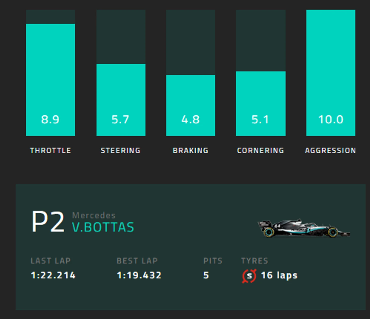 Второе место занял Валттери Боттас из «Мерседеса» – с оценкой в 6,9. Она сложилась из 8,9 за работу с педалью газа, 5,7 за работу рулем, 4,8 за работу на торможениях, 5,1 за прохождение поворотов и 10 за «агрессивность». №77 стартовал и финишировал вторым.