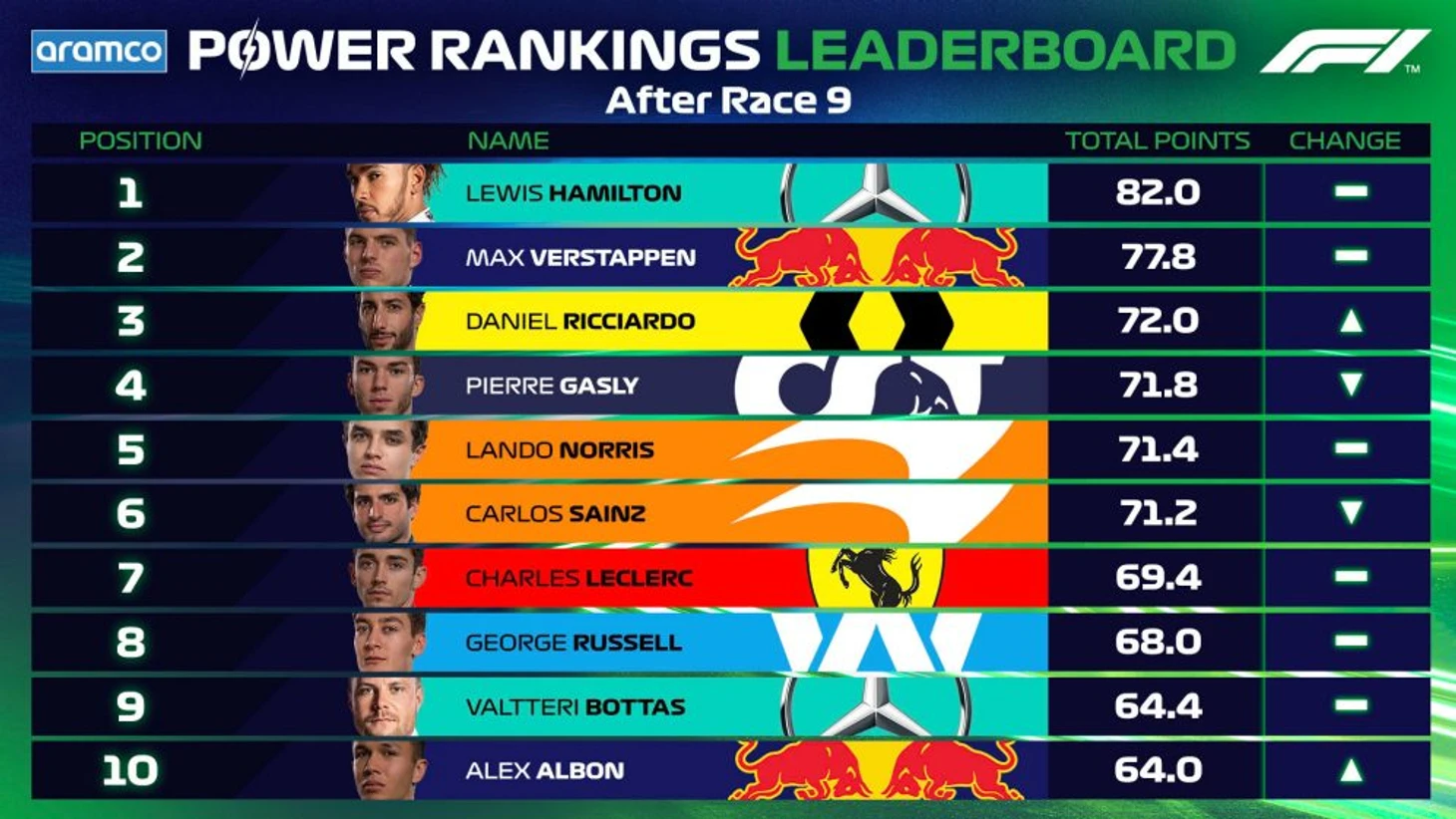 На официальном сайте «Формулы-1» после каждого Гран-при выпускают чарт лучших гонщиков. Его формирует объединение пяти экспертов на основании пяти ключевых характеристик без влияния уровня машины. Оценки экспертов сводят в единый «гоночный рейтинг», с помощью которого в процессе сезона высчитают топ-10 по сезону, а также средний балл ко конкретному этапу.