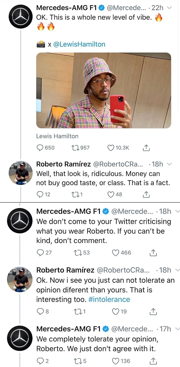 «Мерседес»: «Роберт, мы не приходим в твой твиттер и не критикуем твою одежду. Если не можешь быть вежливым, не комментируй».