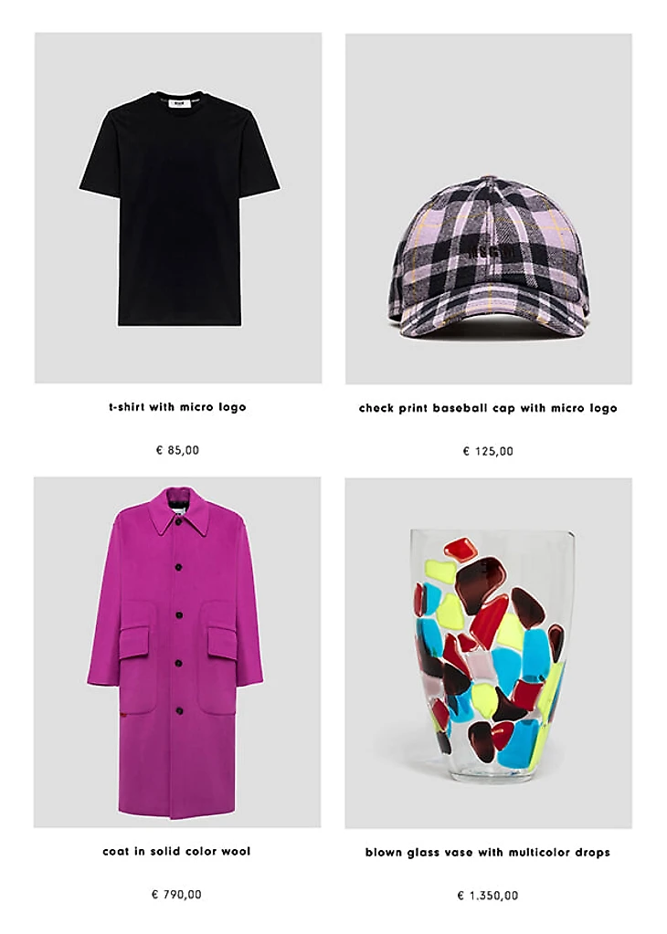 И действительно: в текущей коллекции бренда есть много необычных принтов и дерзких цветов, цепляющих глаз. Даже знакомая клетка – правда в другом цветом сочетании. Цены варьируются от 90 евро за обычную футболку до 790 евро за шерстяное пальто, а самый дорогой предмет на сайте (внезапно) – ваза для цветов из коричнево стекла с разноцветными стеклянными вставками за 1350 евро.