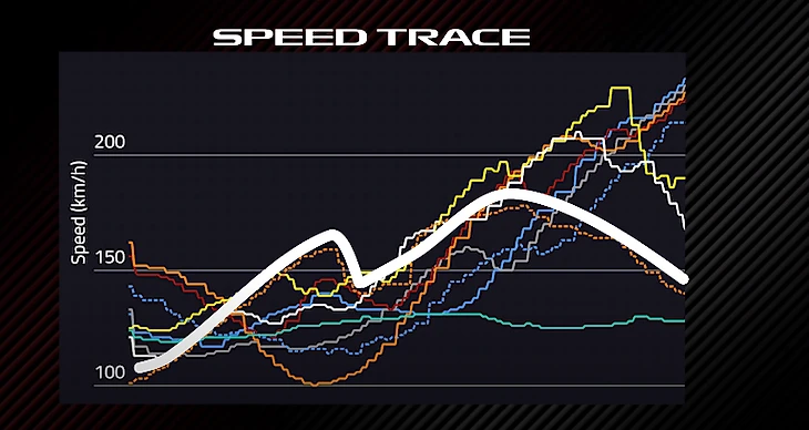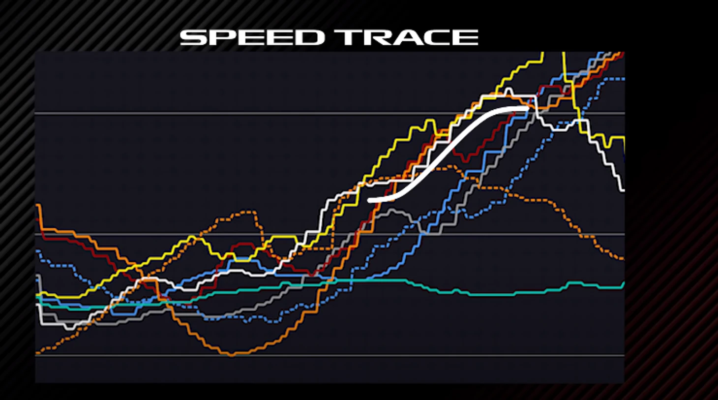 Следующий занятный график – прерывистая оранжевая линия Ландо Норриса из «Макларена». Как видите, его скорость меняется чуть сильнее – то выше, то ниже.