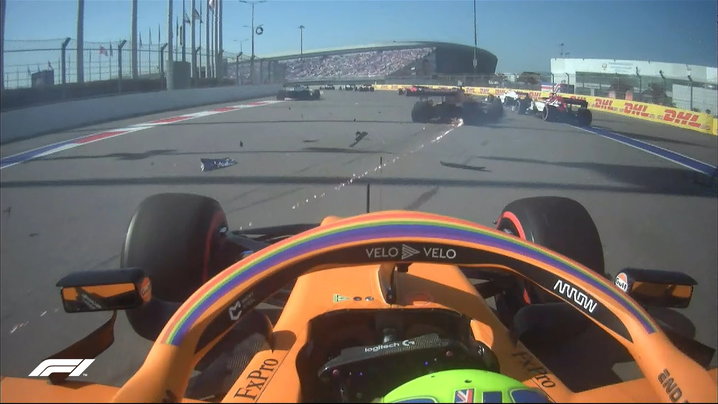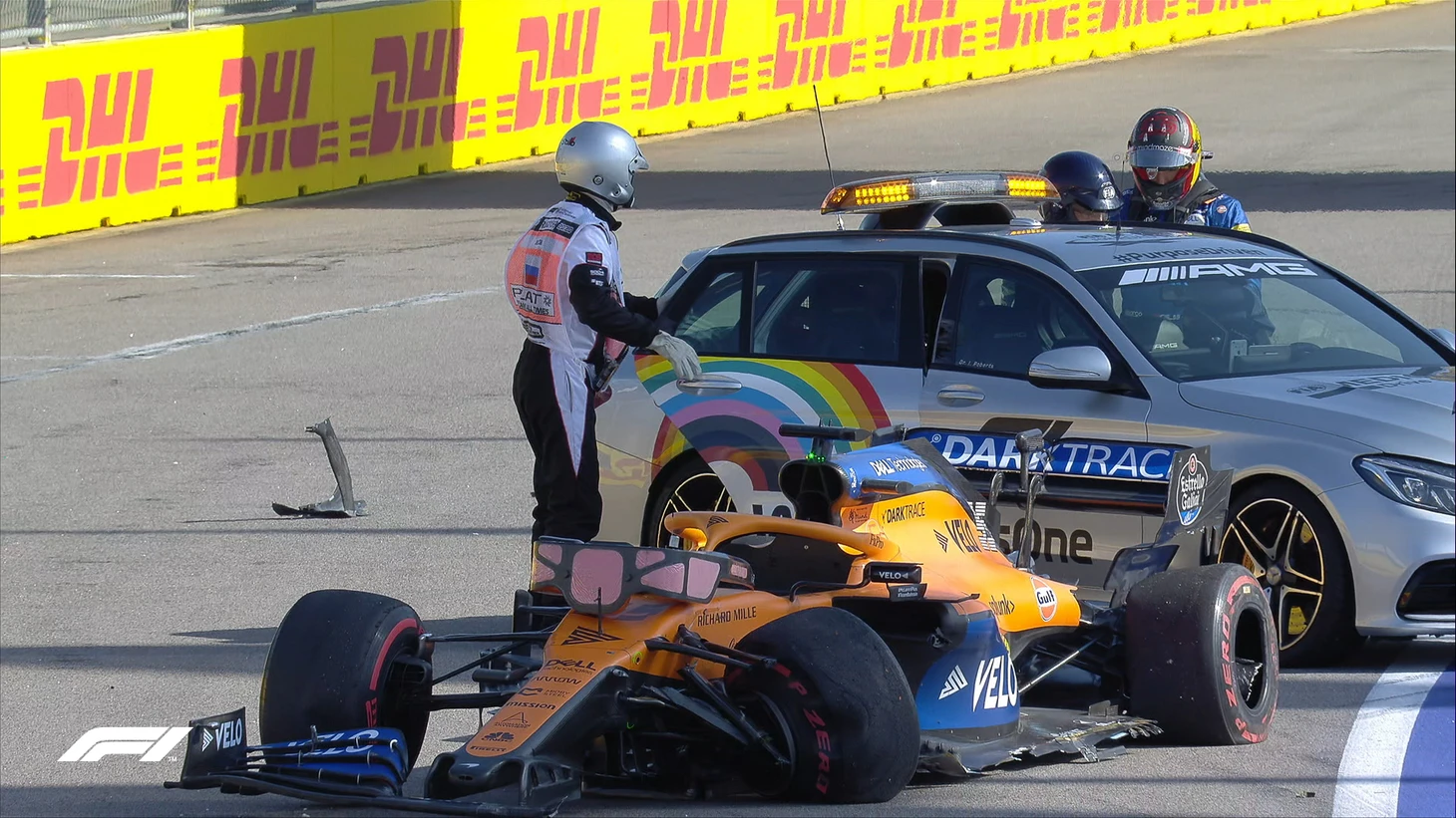 4 круг. Норрис сейчас едет последним, 18-м, и жалуется на плохую управляемость. Он отмечает, что проехал по обломкам от машины Сайнса – возможно, дело в этом.