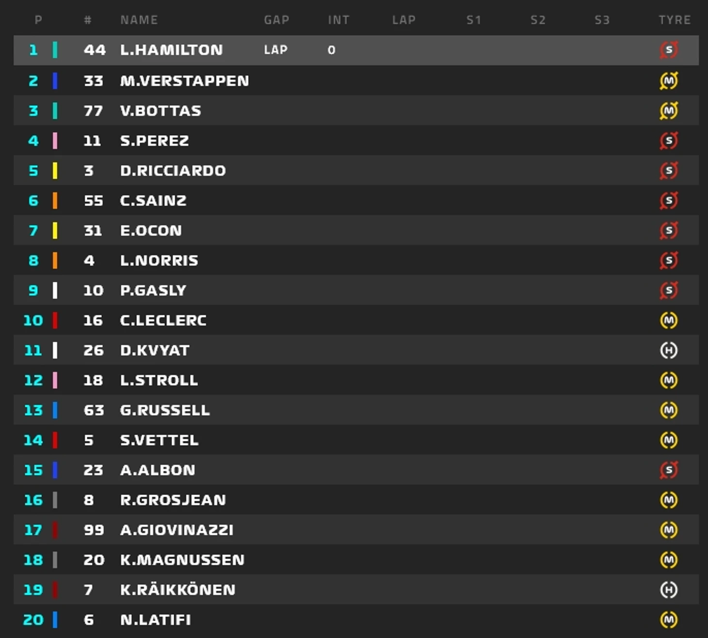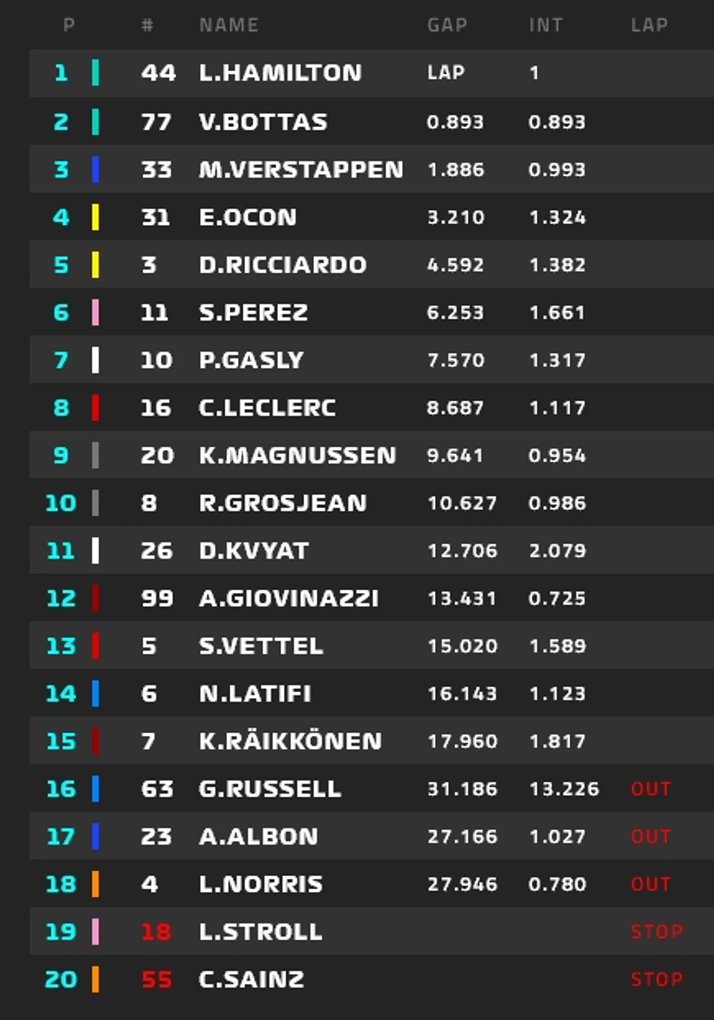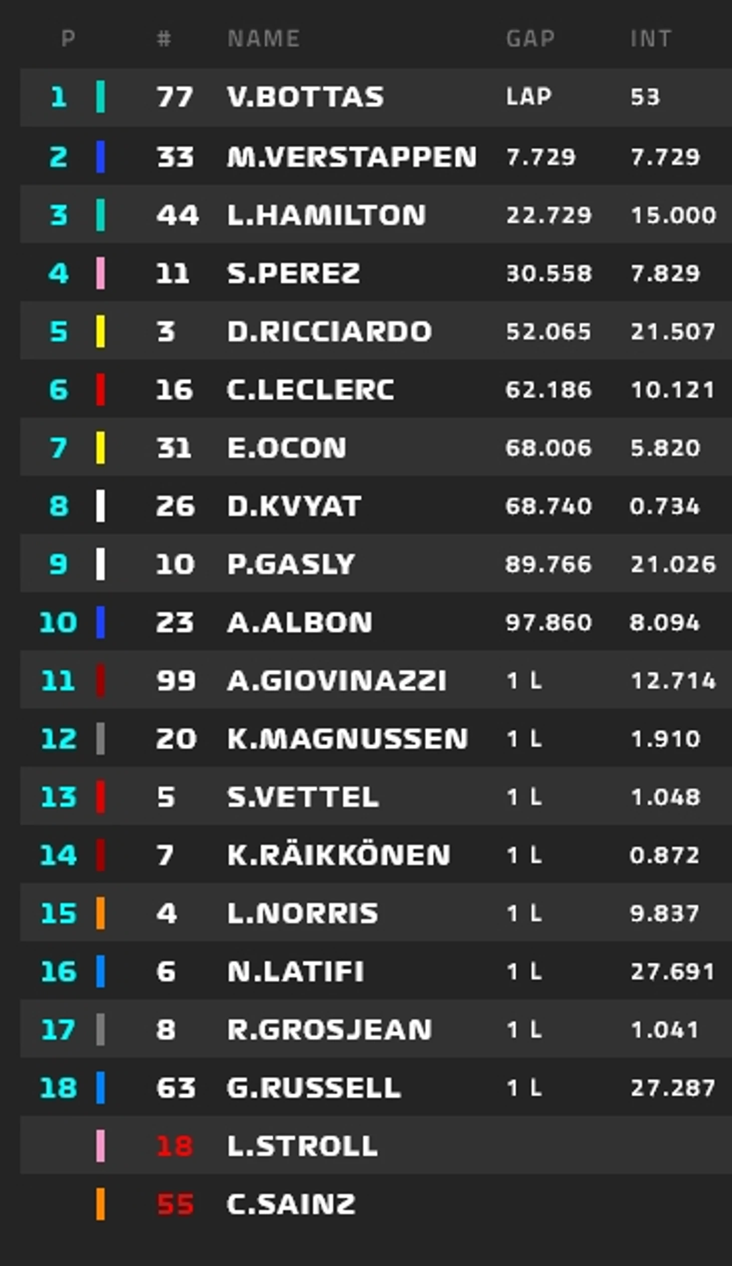 Хэмилтон уверенно удержал лидерство, Боттас – второй, Ферстаппен – третий. Без изменений в группе лидеров.