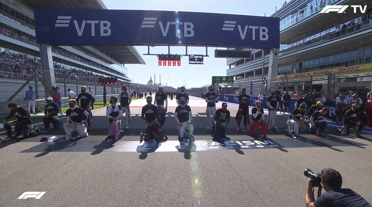 13:55 Гонщики (не все) вновь постояли на коленях, а затем военный хор исполнил гимн России.