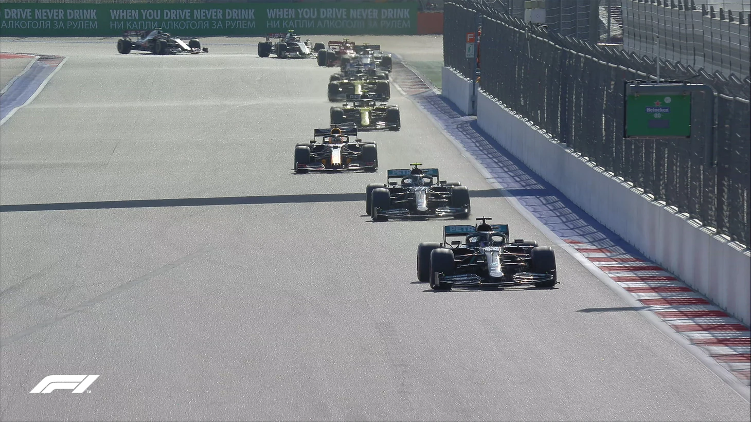 Старт! Боттас не сумел достойно воспользоваться слипстримом и не протиснулся мимо Хэмилтона – Льюис удержался вперед напарника. Ферстаппен срезал второй поворот, но остался вторым.