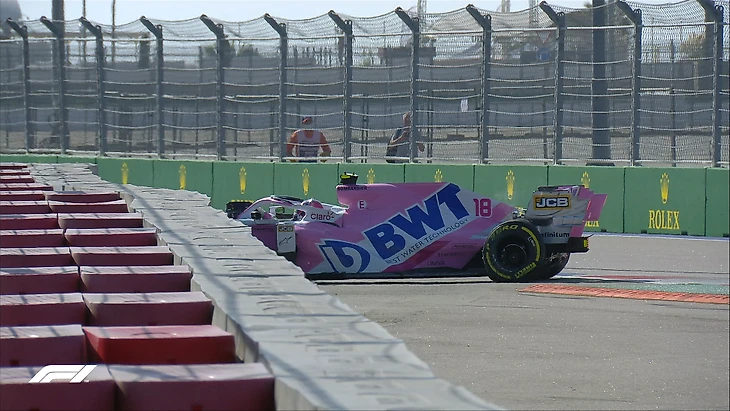3 круг. Показали повторы аварий. Сайнс ошибся сам и задел стену, когда возвращался на трек. Стролла развернуло в том же повороте, где вчера Феттеля – но, кажется, не без помощи соперников сзади.
