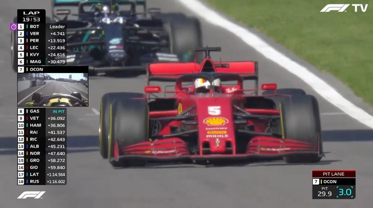 21-й круг. Перес перешел с «софта» на на «хард» – он вернулся прямо перед Феттелем, 6-м. В тройке лидеров сейчас Боттас, Ферстаппен и... Леклер!