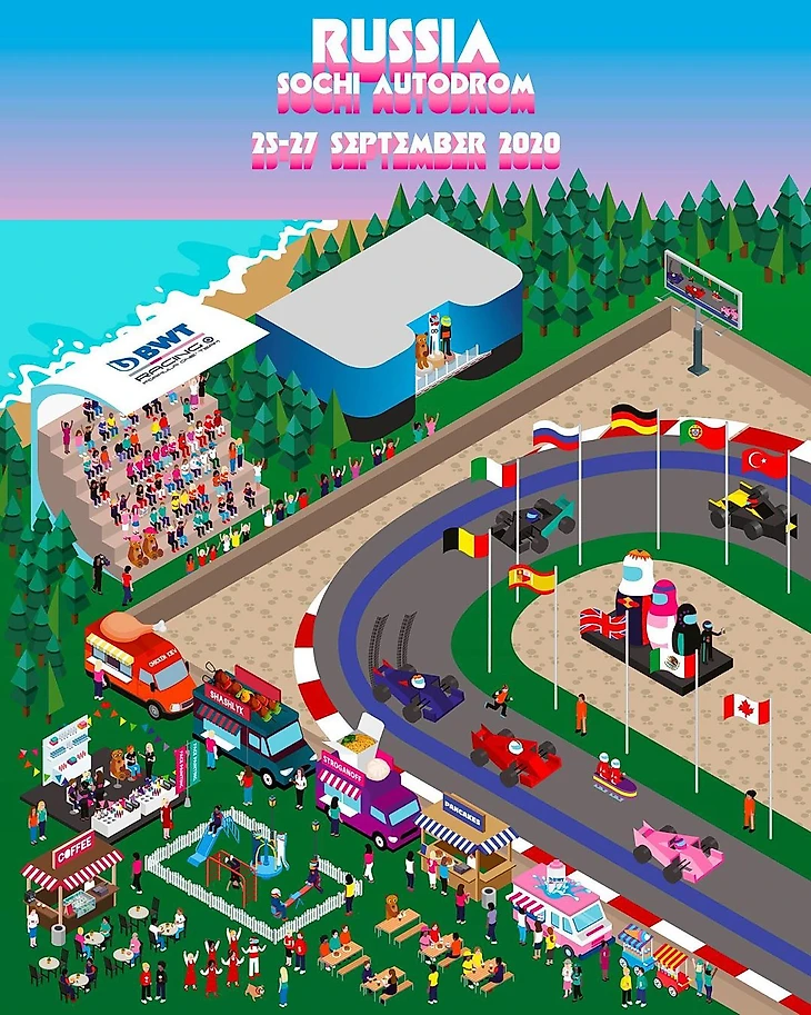 Русский колорит все иностранцы видят по-своему – и так же по-своему его передают. На постеры для Гран-при «Формулы-1» это тоже распространяется – к примеру, «Рейсинг Пойнт» (будущая команда Феттеля, переходящая под бренд «Астон Мартин») нарисовала вот такую афишу для этапа на «Сочи Автодроме».