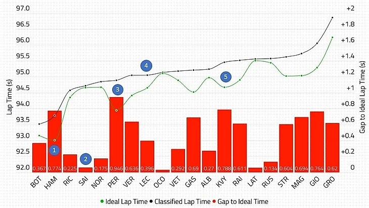 Как же тогда Даниэль Риккардо очутился в тройке лидеров? Объясняет еще один расчет от «Формулы-1» – просто австралийский пилот чуть ли не единственным собрал в практиках практически идеальные для возможностей машины круги. Как и Эстебан Окон.