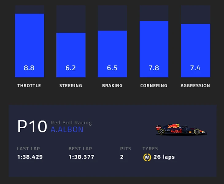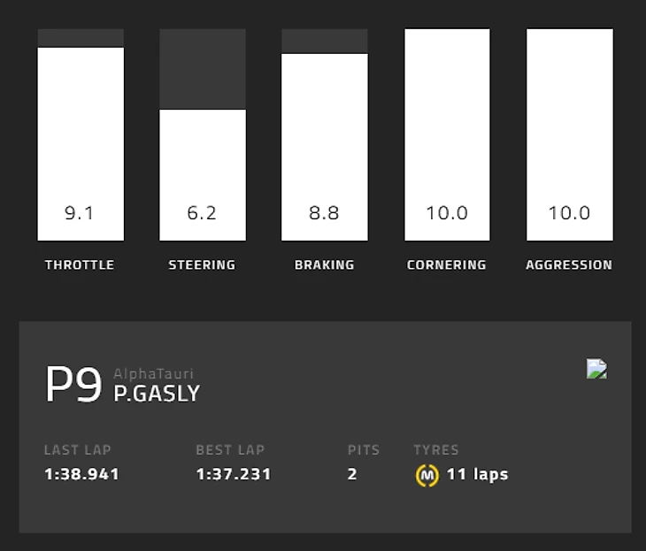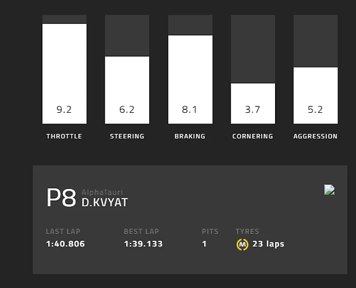 Даниил Квят из «Альфа Таури» наездил на оценку в 6,5 баллов. Она сложилась из 9,2 за работу с педалью газа, 6,2 за работу рулем, 8,1 за работу на торможениях, 3,7 за прохождение поворотов и 5,2 за «агрессивность». Россиянин стартовал 11-м и приехал на финиш 8-м.