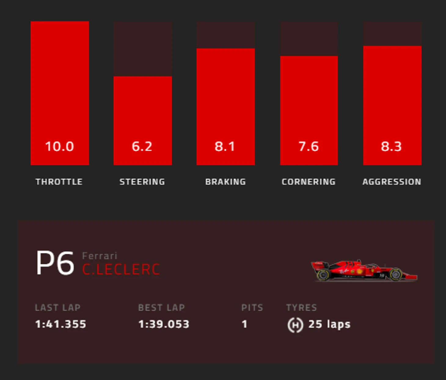 Второе место занял Шарль Леклер из «Феррари» – с оценкой в 8,1. Она сложилась из 10 за работу с педалью газа, 6,2 за работу рулем, 8,1 за работу на торможениях, 7,6 за прохождение поворотов и 8,3 за «агрессивность». Шарль стартовал 10-м и финишировал 6-м.