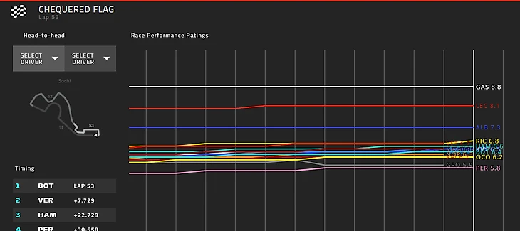 После каждой гонки на официальном сайте «Формулы-1» в разделе лайвтайминга на странице «выступлений» публикуются оценки пилотам за Гран-при по данным телеметрии. Вот – рейтинг после заезда по «Сочи Автодрому».