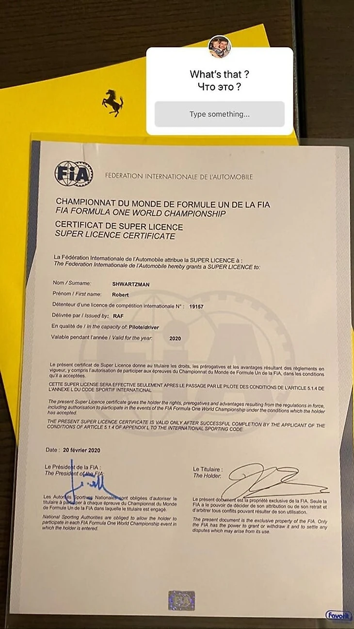 Однако спад в результатах не убрал питерца из претендентов на место в «Ф-1» уже в 2021-м – особенно с учетом уже оформленной суперлицензии, позволяющей гонять на самых быстрых болидах мира. Ее Роберт показал фанатам в соцсетях сразу после объявления о тестах.