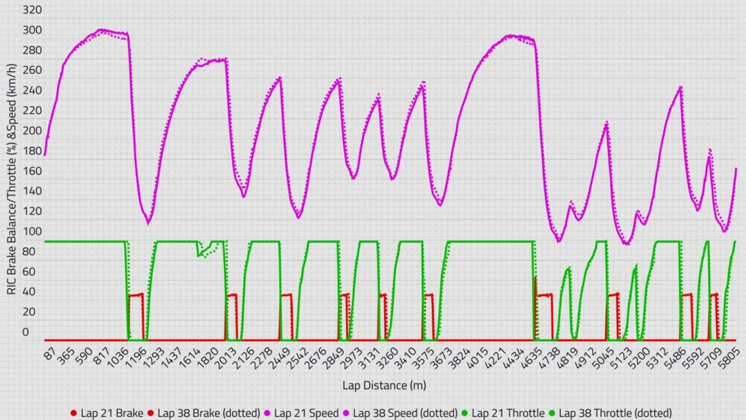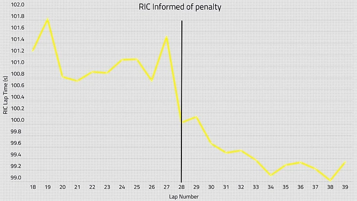 После штрафа австралиец позже нажимал на педаль тормоза и отпускал педаль газа, а также раньше начинал разгоны. На 10 кругах до объявления о штрафе Дэн проезжал в среднем 52,2 процента дистанции с полным газом и на средней скорости 206 км/ч, а после обещания ускориться включится на полную – и проехал следующие 10 кругов с 57,2 процентами дистанции и на средней скорости в 210 км/ч.
