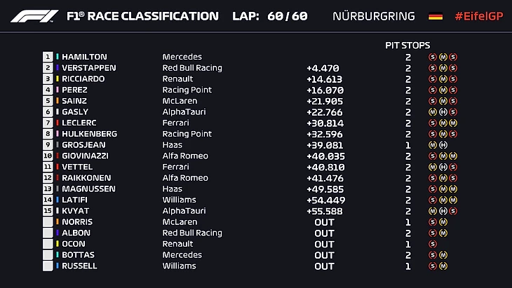 Шансы уравнял (искусственный) автомобиль безопасности: все лидеры отправились в боксы за «красными», но на расстановку сил в топ-5 это никак не отразилось. Леклер и Грожан от визита на пит-лэйн отказались: изначально это решение казалось довольно опрометчивым, но в итоге оба пропустили не так и много народу. Гасли добился очередного фантастического результата, финишировав шестым, Хюлькенберг с последнего места на стартовой решетке доехал до восьмого места, а десятку замкнул проводящий, пожалуй, лучший гран-при в сезоне Джовинацци.