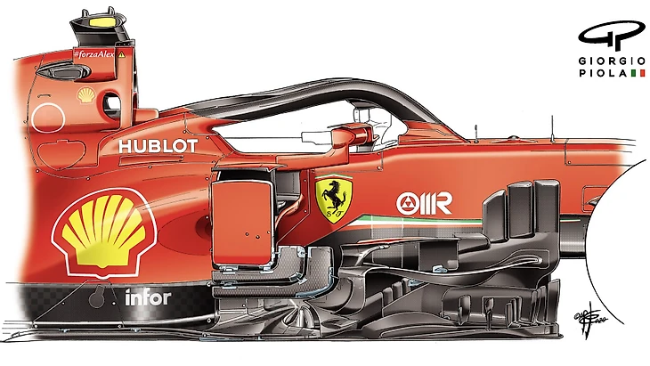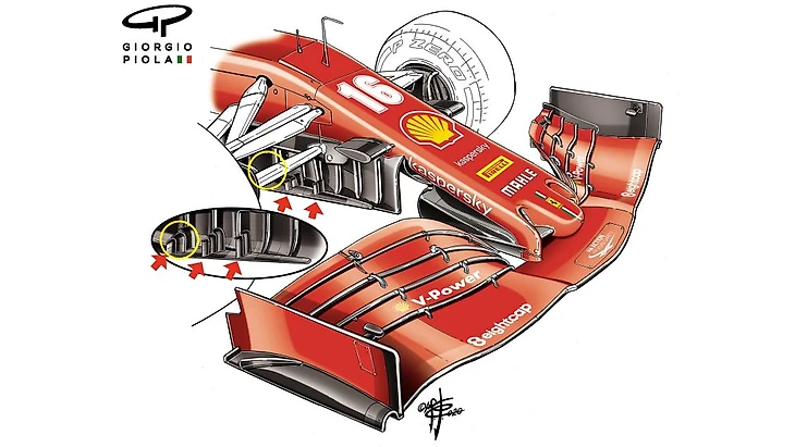 «Скудерия» продолжает совершенствовать аэродинамику машины в рамках существующей философии, основанной на нестандартной комбинации переднего крыла с широким носом, которое, как объясняется здесь, лучше работает в быстрых поворотах, чем в медленных.