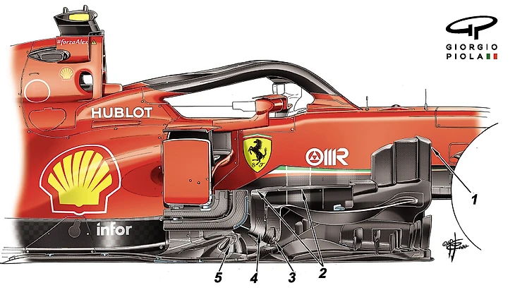 Все эти изменения, направленные на увеличение объема воздушного потока к днищу, должны повысить эффективность днища при создании прижимной силы, что позволит добиться более эффективных аэродинамических характеристик (отношения прижимной силы к лобовому сопротивлению). Это имеет большое значение, потому что «Феррари» потеряла в мощности мотора после предсезонных технических директив.