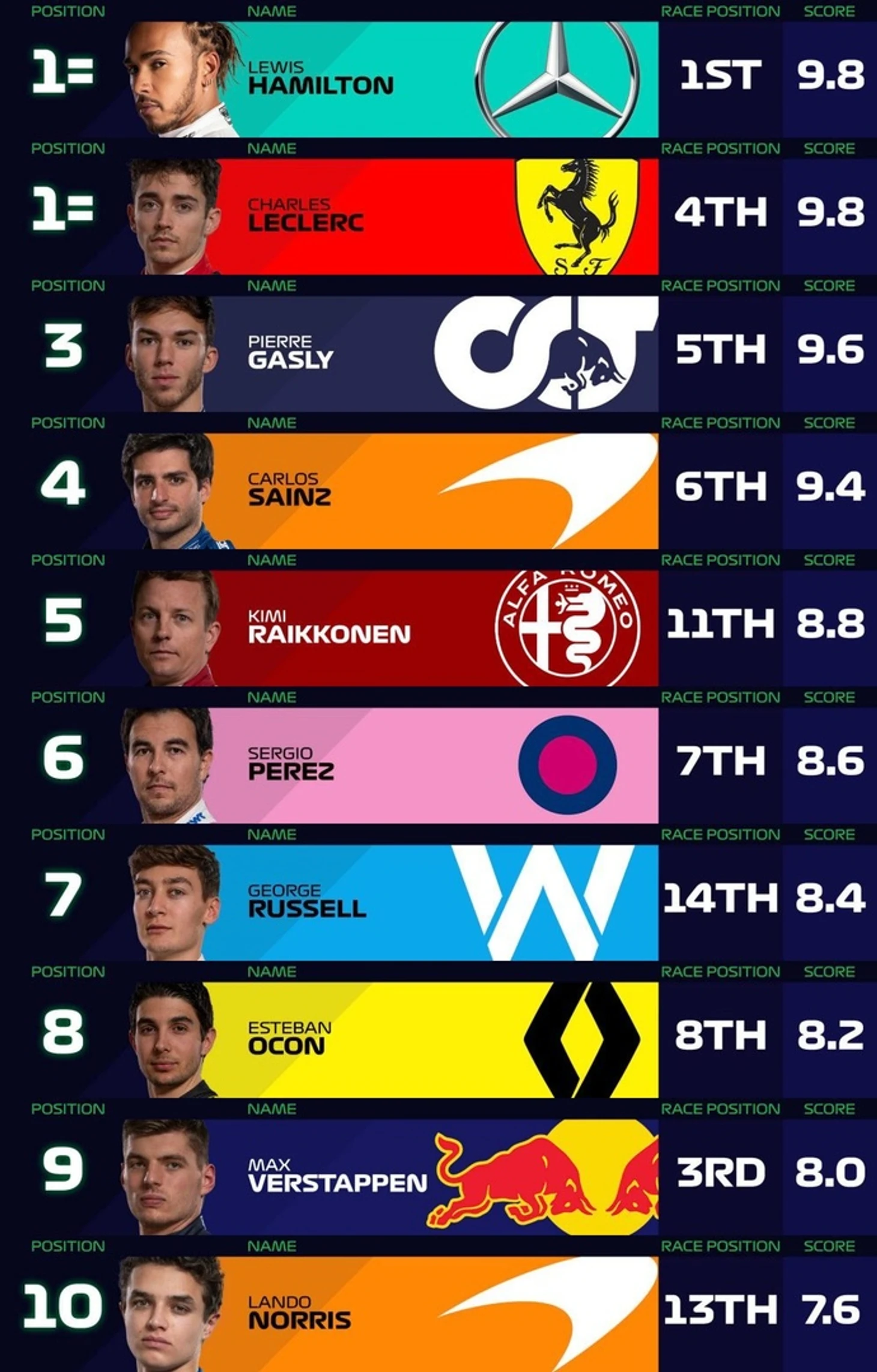 На официальном сайте «Формулы-1» после каждого Гран-при выпускают чарт лучших гонщиков. Его формирует объединение пяти экспертов на основании пяти ключевых характеристик без влияния уровня машины. Оценки экспертов сводят в единый «гоночный рейтинг», с помощью которого в процессе сезона высчитают среднегодовой уровень, а также средний балл ко конкретному этапу.