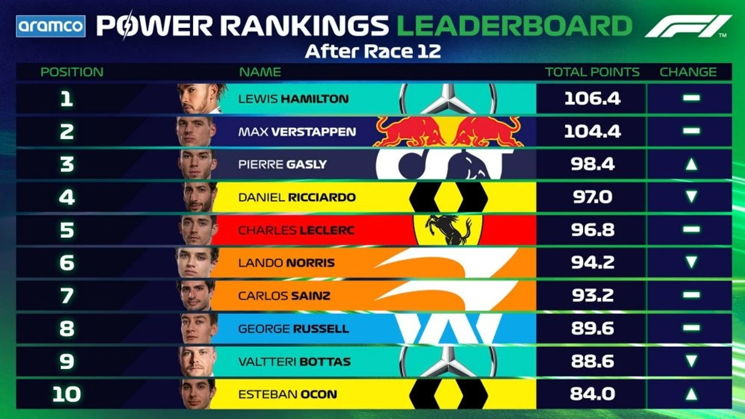 Состояние после 12-ти гонок сезона: Пьер Гасли ворвался в топ-3 Валттери Боттас вновь упал на 9-е, а Даниил Квят вылетел из десятки лучших после провала на «Алгавре» – его обогнал Эстебан Окон.