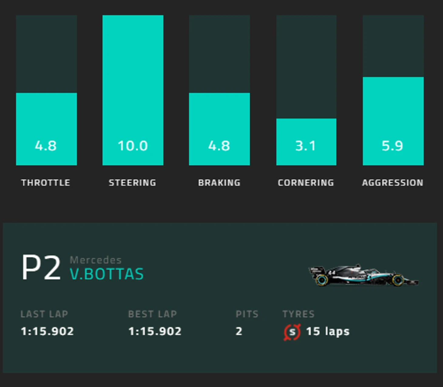 Третье место занял Валттери Боттас из «Мерседеса» – с оценкой в 5,7. Она сложилась из 4,8 за работу с педалью газа, 10 за работу рулем, 4,8 за работу на торможениях, 3,1 за прохождение поворотов и 5,9 за «агрессивность». Финн стартовал первым, но финишировал вторым.