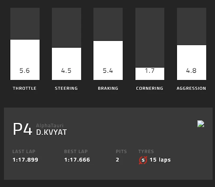 Даниил Квят из «Альфа Таури» получил оценку в 4,4 балла – а вот его разбивка: 5,6 за работу с педалью газа, 4,5 за работу рулем, 5,4 за работу на торможениях, 1,7 за прохождение поворотов и 4,8 за «агрессивность». Россиянин стартовал восьмым и финишиовал 4-м.