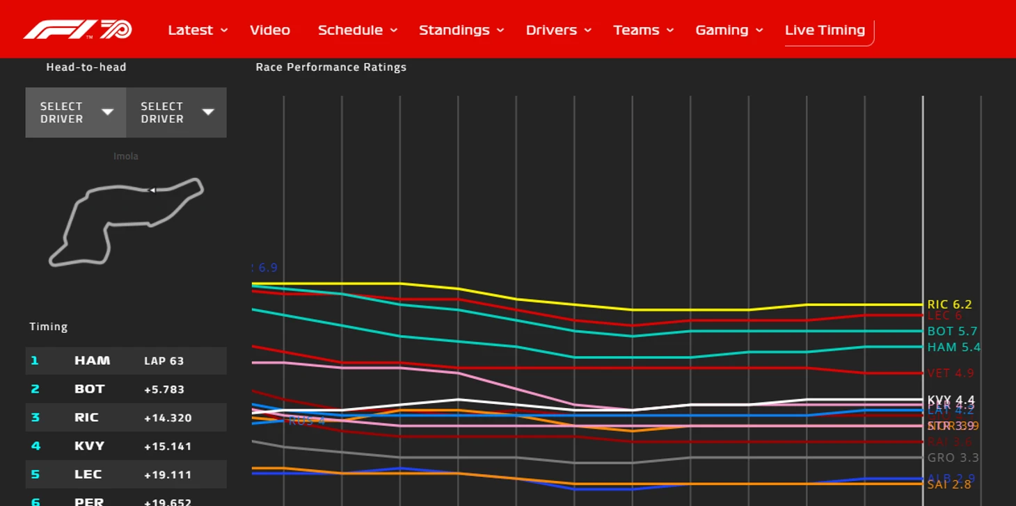 После каждой гонки на официальном сайте «Формулы-1» в разделе лайвтайминга на странице «выступлений» публикуются оценки пилотам за Гран-при по данным телеметрии. Вот – рейтинг после заезда в Имоле.